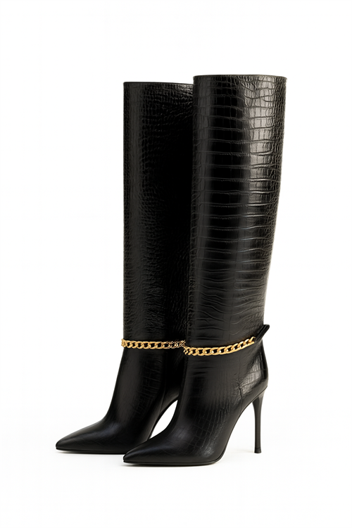 Chain Luxe İnce Topuklu Çizme Siyah -