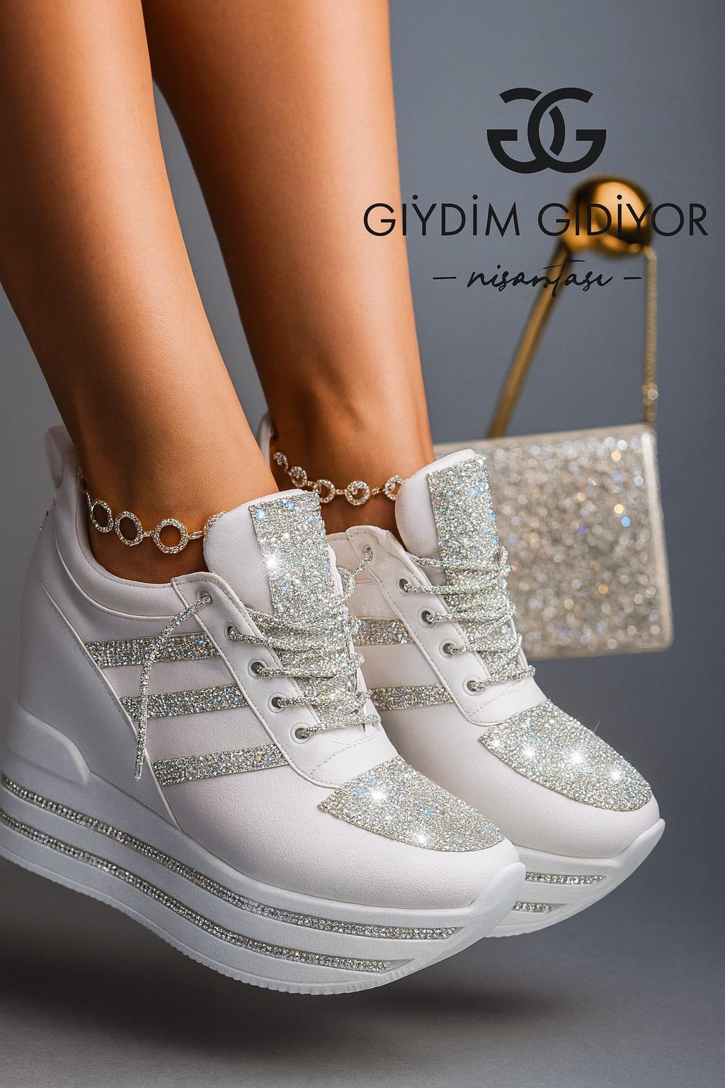 Ashley Kristal Taşlı Gizli Topuk Spor Ayakkabı Beyaz