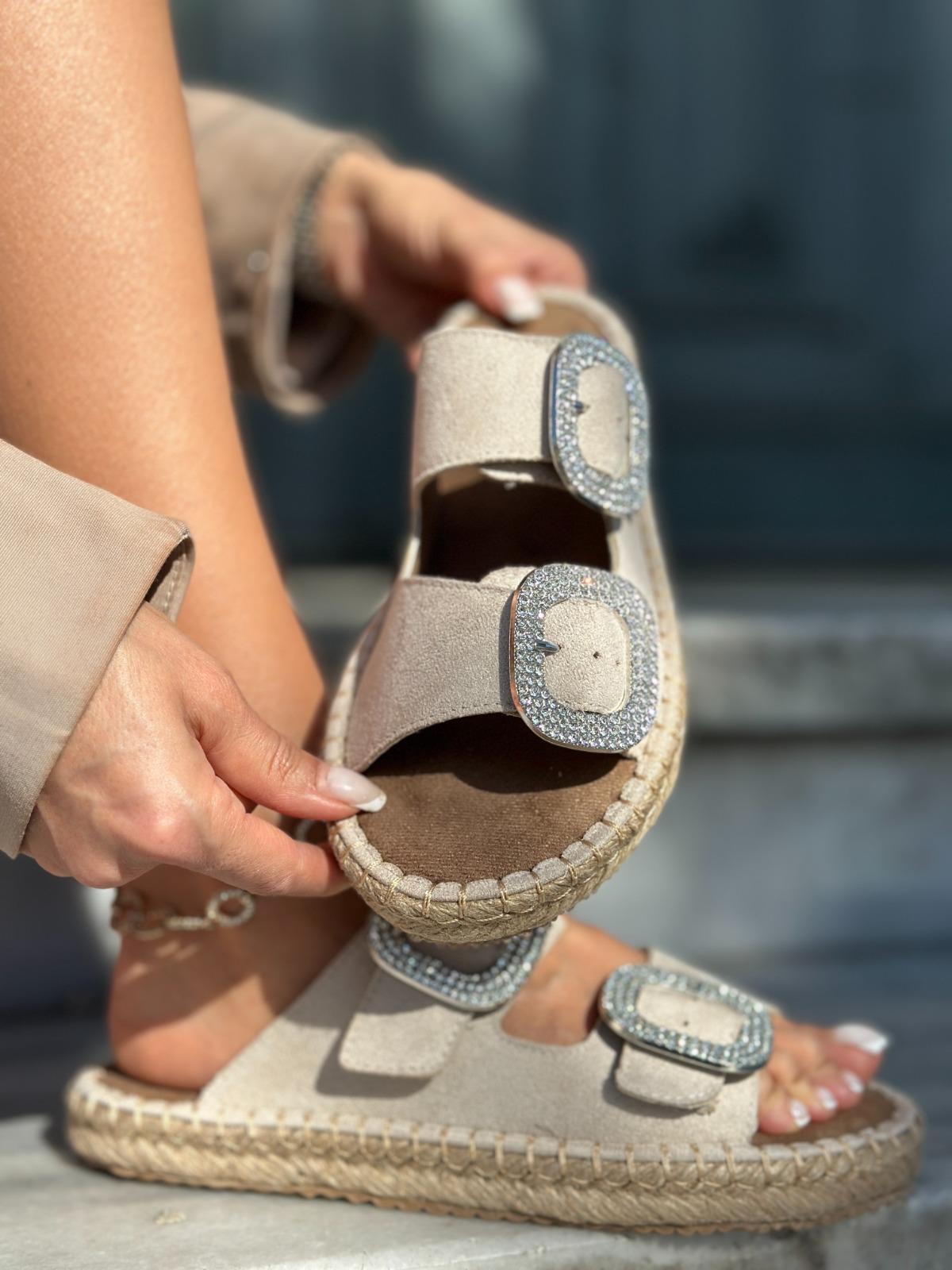 Sugua Kristal Taşlı Hasır Taban Terlik Bej - WOMAN SHOES