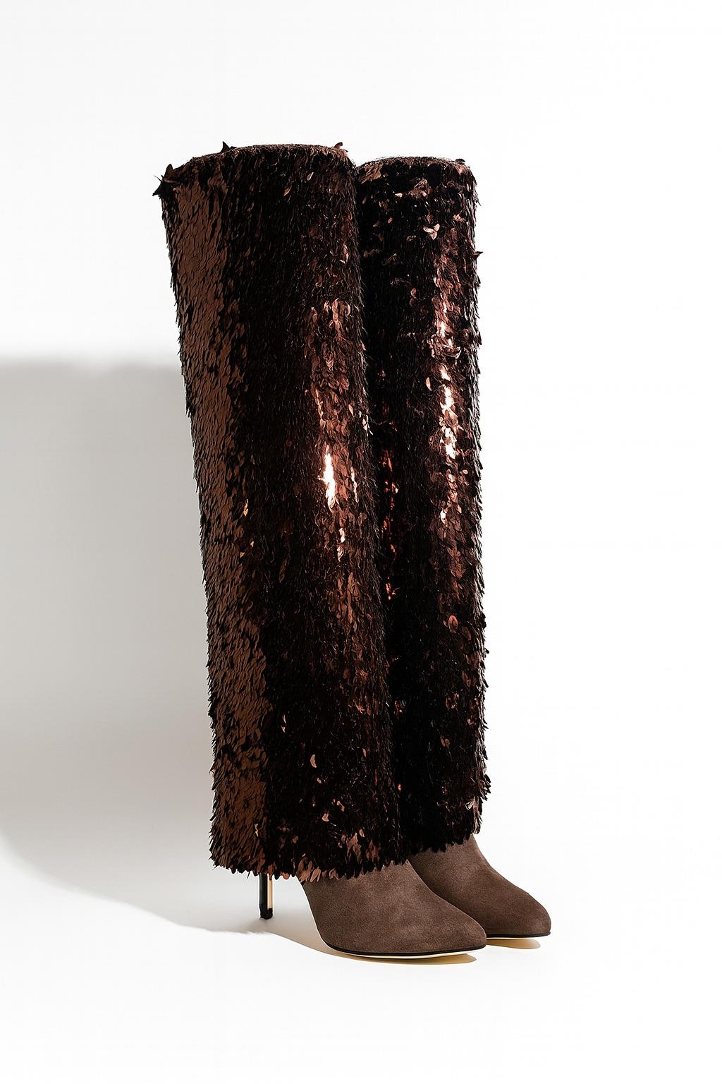 • Parlak Pul Kaplama (Diz Üstü): Çizmenin diz üstü kısmı, yoğun ve büyük pullarla tamamen kaplanmıştır. Işığı her açıdan yansıtarak çarpıcı ve sahneye hazır bir görünüm sunar.