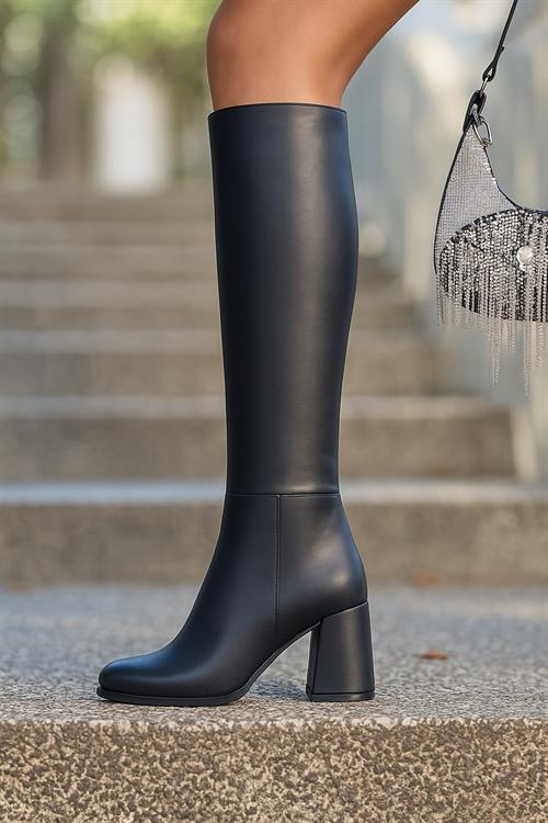 Kalın topuk ve deri tasarımıyla şık ve zarif bir görüntü sağlar.