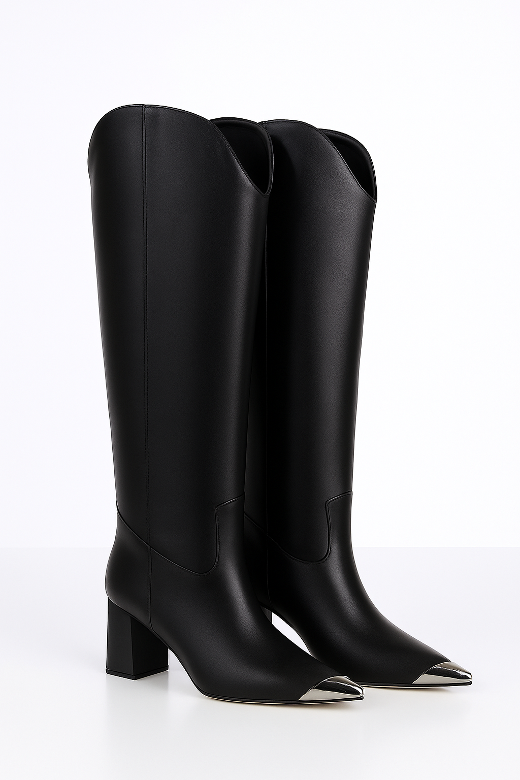 • Burun: Metalik uç detayı, çizmenin modern ve sofistike görünümünü tamamlar. İleriye doğru hafifçe sivrilen burun, zarif bir siluet oluşturur.