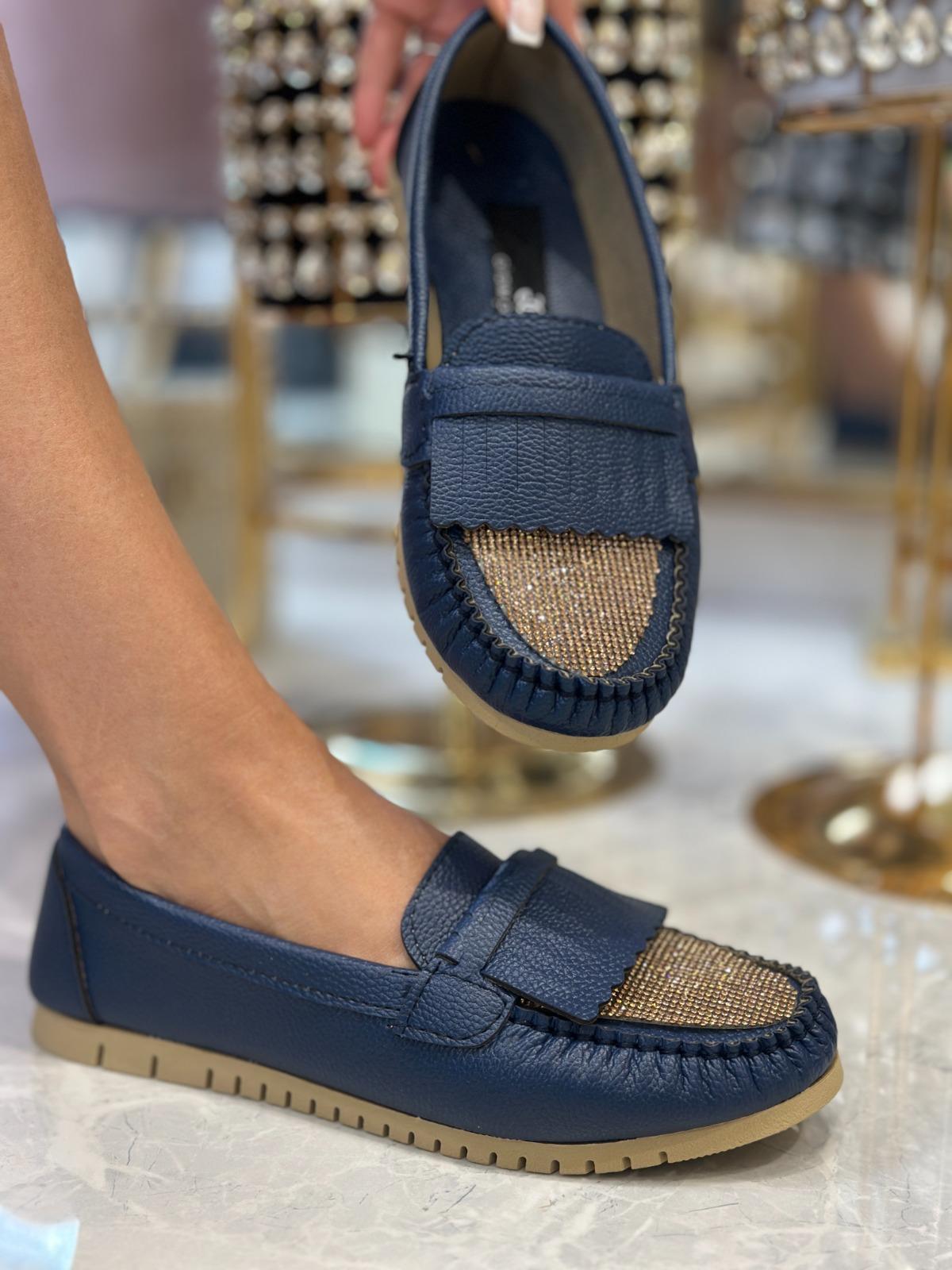 Wine Kristal Taşlı Özel Tasarım Babet Lacivert